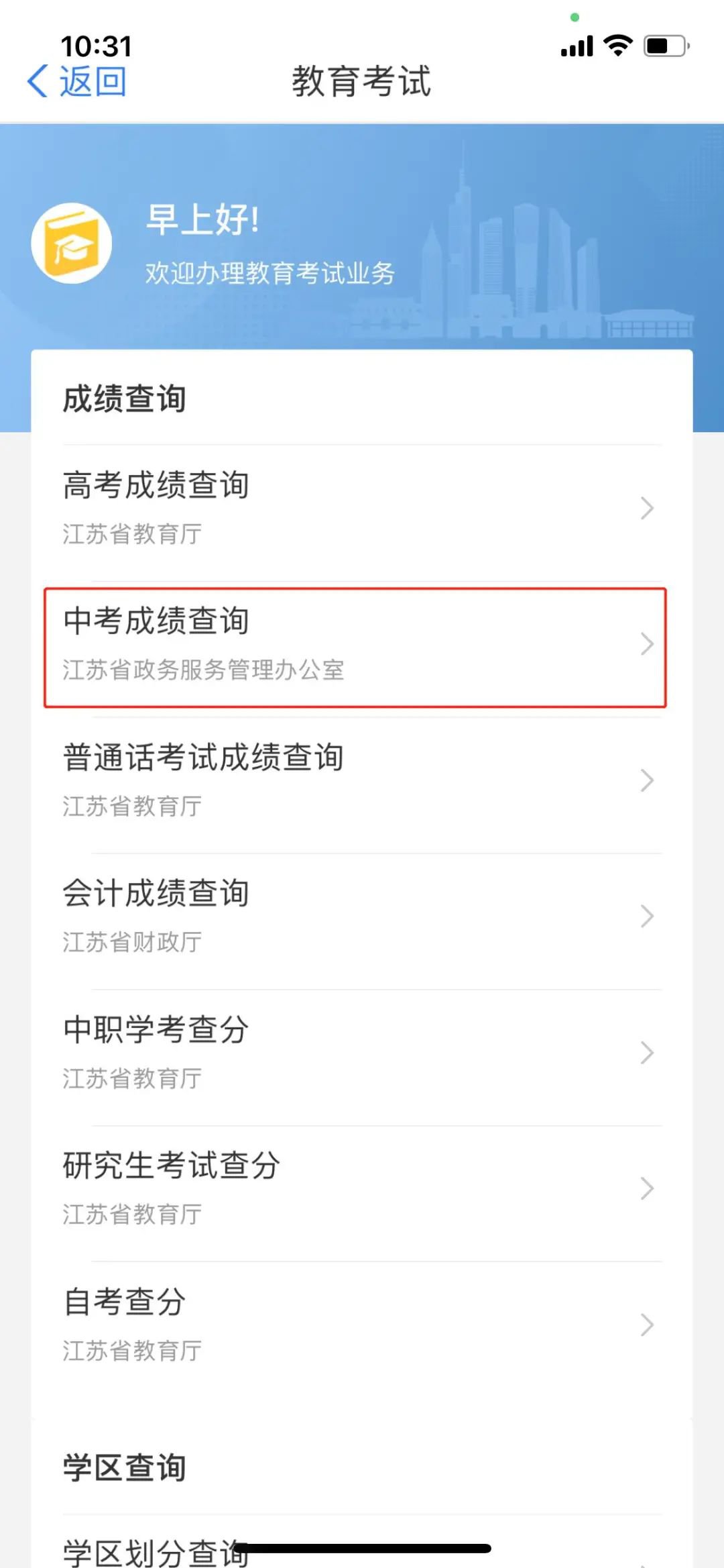 点击首页轮播图进入中考成绩查询应用,或者点击“教育考试”专栏,选择中考成绩查询进入应用