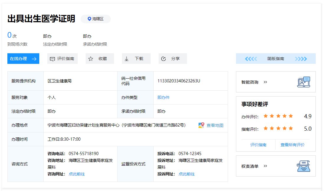 搜索“出生证明”,选择“出具出生医学证明”,然后选择办理区域即可。