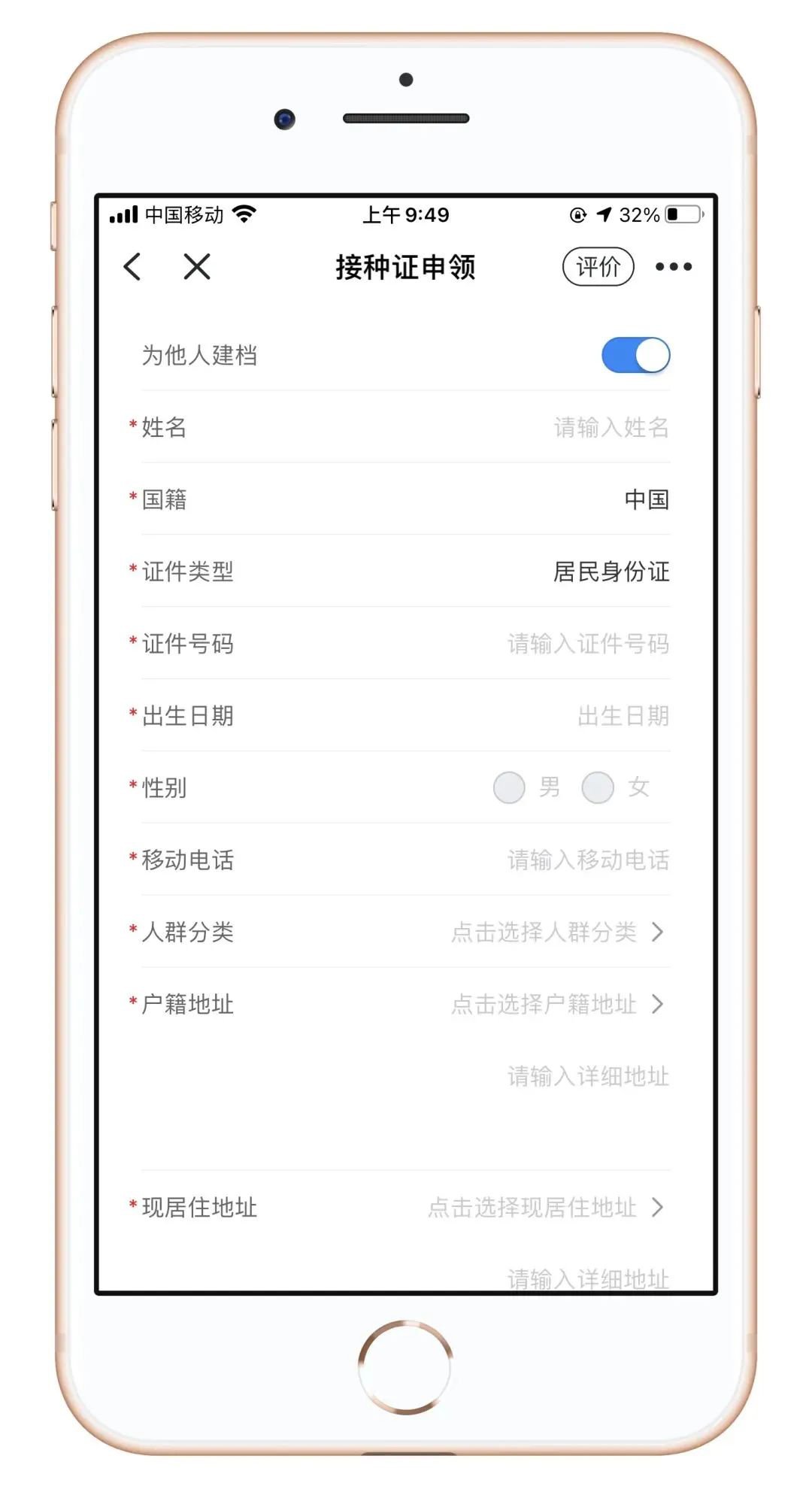 在跳转页填写成人基本信息、户籍地址、现居住地址、工作单位名称后,点击【提交】进行申领,会显示建档成功。申领完成后可切换至【我的】标签页,点击【我的申领】进行查看已申领的电子接种证。