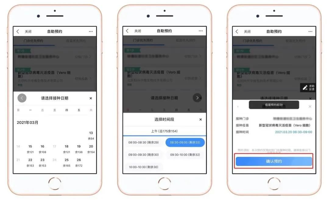 前两步完成后,选择要接种的接种日期。选择日期可以对应看到接种门诊每日所剩的余号。选择需要去的接种时间段后点击“确认预约”显示疫苗预约成功。