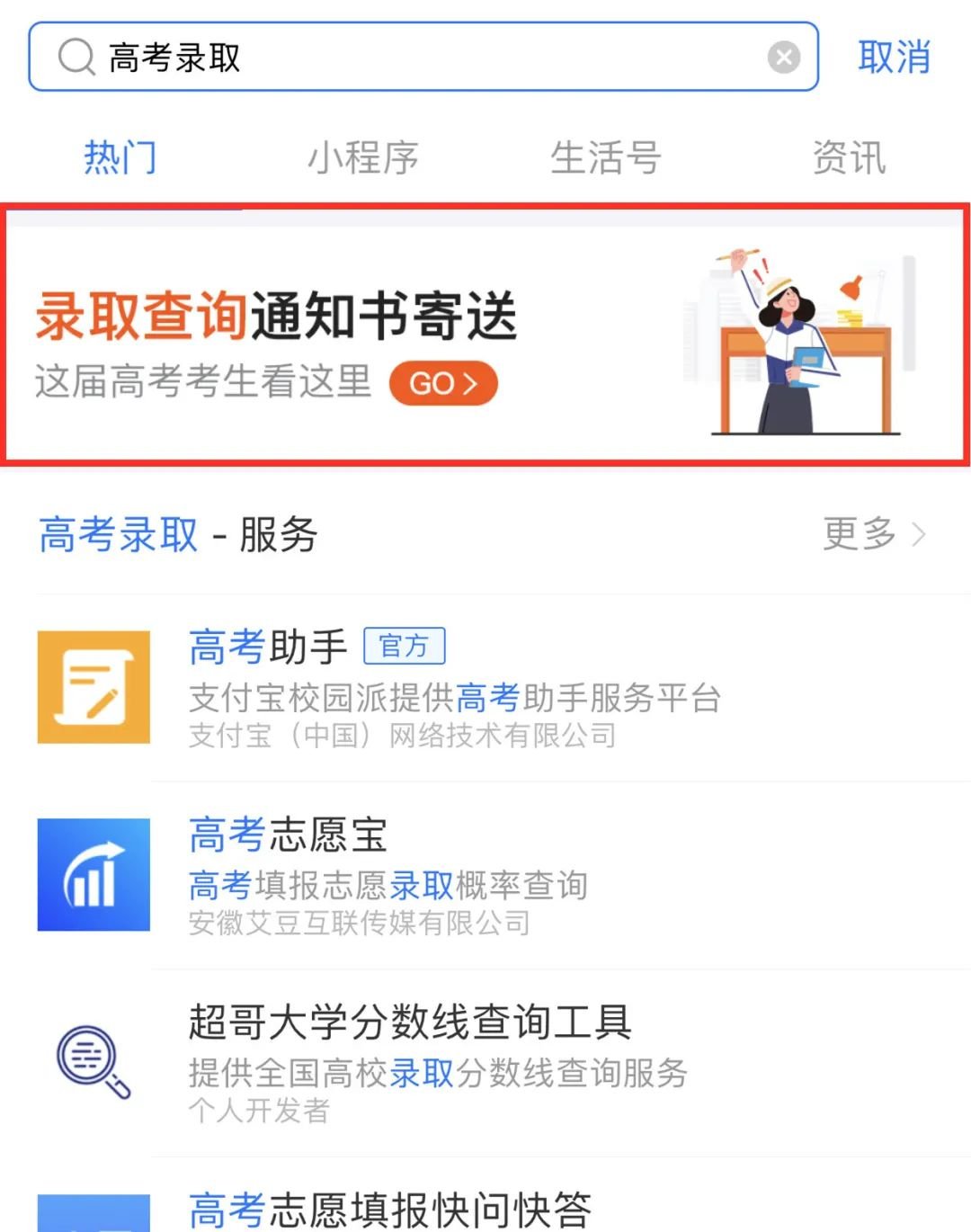 即日起,绍兴考生可通过支付宝查询,高考录取情况和录取通知书寄送信息。