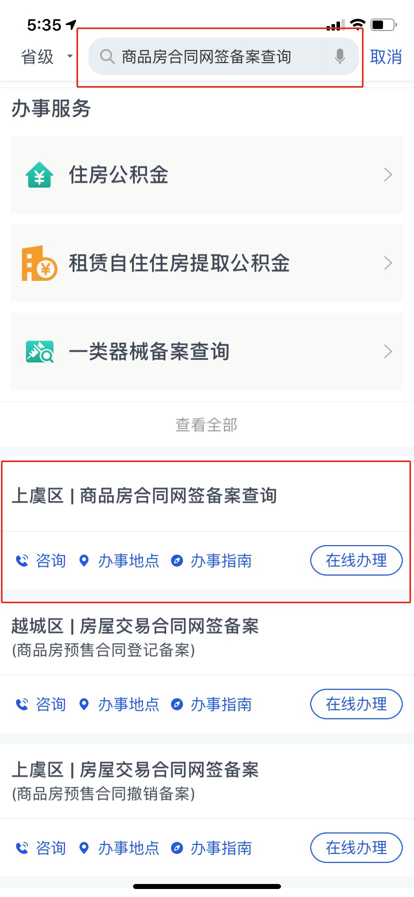 3、找到商品房合同网签备案查询,点“在线办理”,即可查询到网签备案结果。