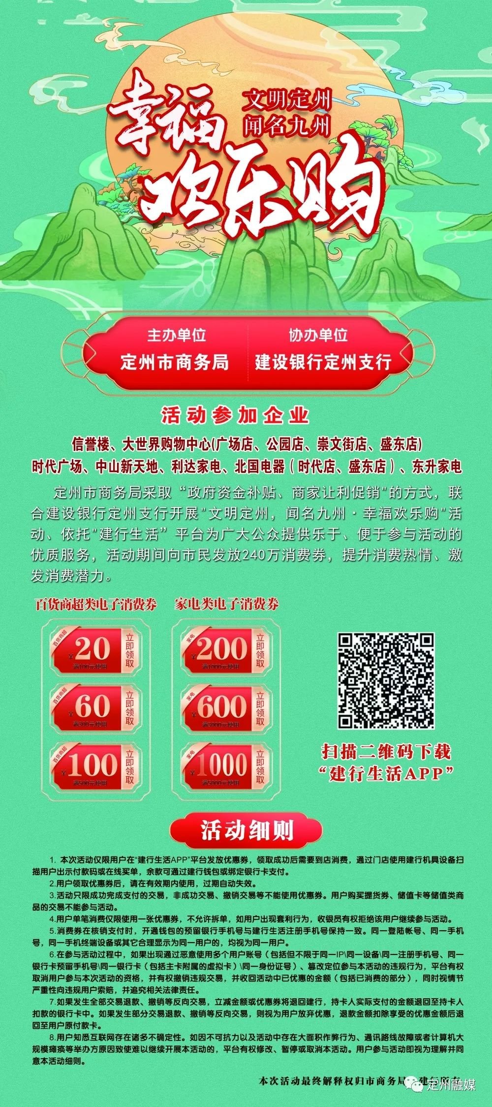 定州市商务局采取“政府资金补贴、商家让利促销”的方式,由市财政出资200万元,建行定州支行出资40万元,通过发放电子消费券,组织开展“文明定州 闻名九州·幸福欢乐购”活动,充分激发消费潜力,让利于民。