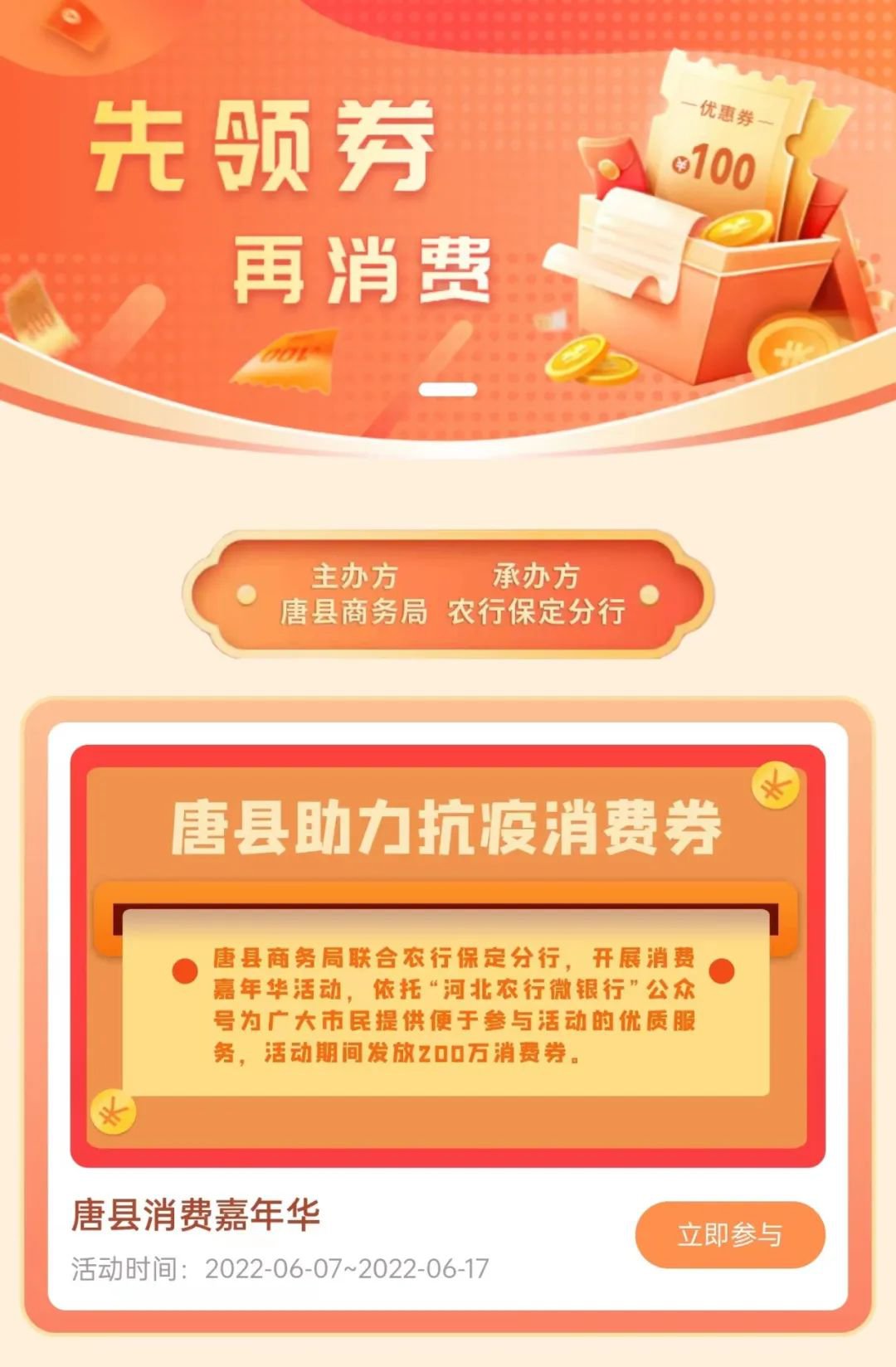 为持续激发市场主体活力和消费热情,唐县采取政府资金补贴的方式,于6月7日至6月17日开展唐县消费嘉年华活动,促进消费回暖,加快市场复苏。唐县政府补贴200万元支持资金,联合农行保定分行,开展消费嘉年华活动,依托“河北农行微银行”公众号为广大市民提供便于参与活动的优质服务。