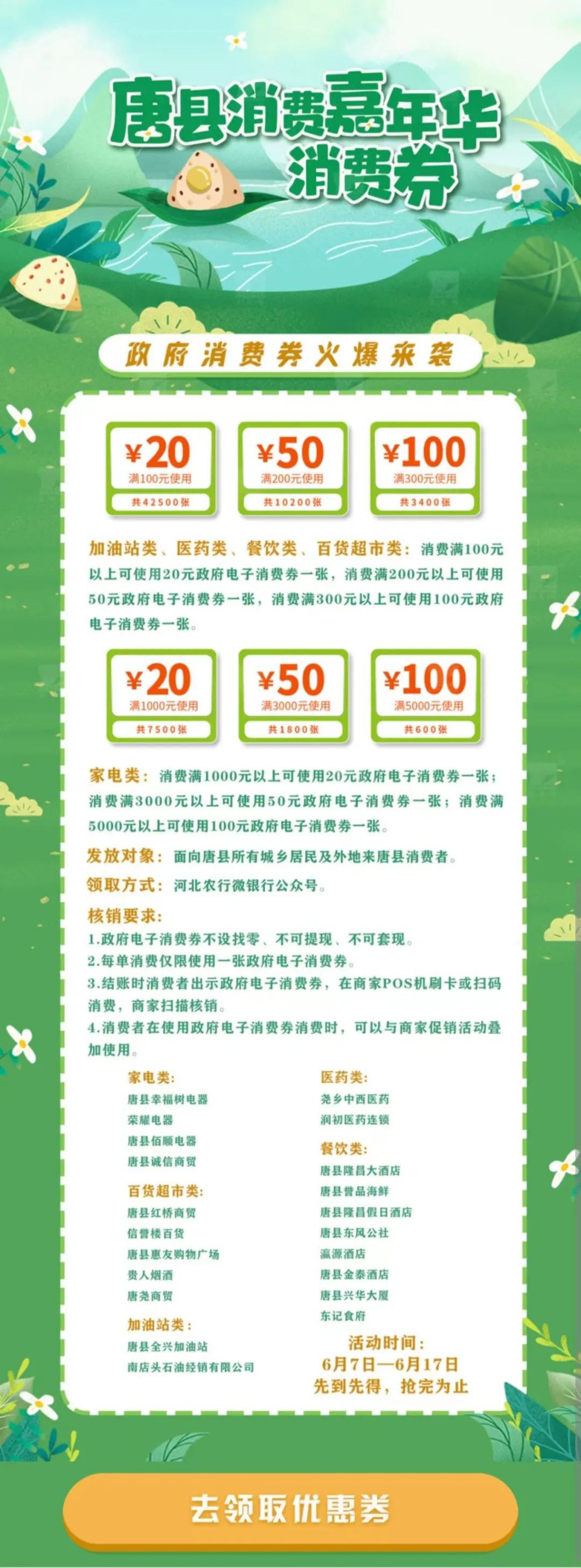 发放对象:面向唐县所有城乡居民及外地来唐县消费者。