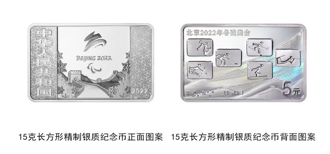 15克长方形银质纪念币背面图案为冬残奥会6个运动项目体育图标,辅以核心图形、雪花、“北京2022”盲文等元素组合设计,并刊“北京2022年冬残奥会”字样及面额。