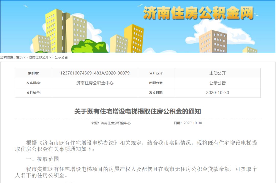 明确在济南市实施既有住宅增设电梯项目的房屋产权人及配偶且在本市无住房公积金贷款余额,可提取个人名下的住房公积金。