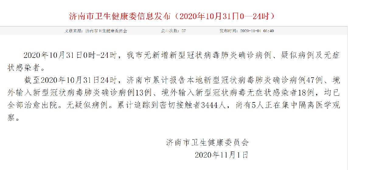 截至2020年10月31日24时,济南市累计报告本地新型冠状病毒肺炎确诊病例47例、境外输入新型冠状病毒肺炎确诊病例13例、境外输入新型冠状病毒无症状感染者18例,均已全部治愈出院。无疑似病例。累计追踪到密切接触者3444人,尚有5人正在集中隔离医学观察。