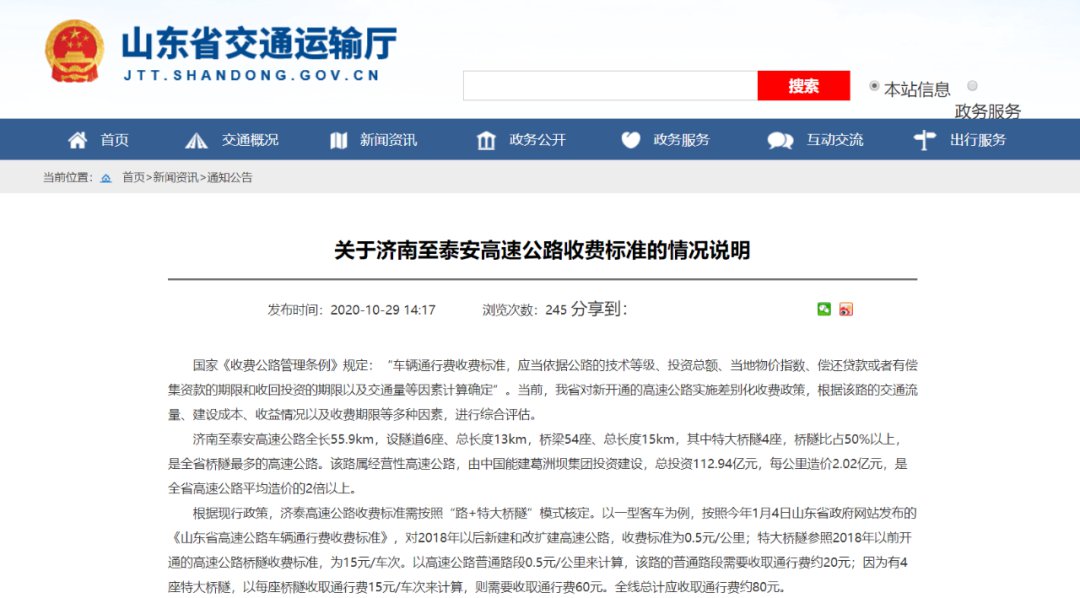 2020年10月29日,山东省交通运输厅官方网站公示了,《关于济南至泰安高速公路收费标准的情况说明》: