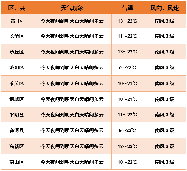 25日夜间到26日白天晴间多云,南风3级,明晨最低气温济阳区、莱芜区、钢城区、商河县、南山区8℃左右,市区及其它区县13℃左右,明天最高气温22℃左右。