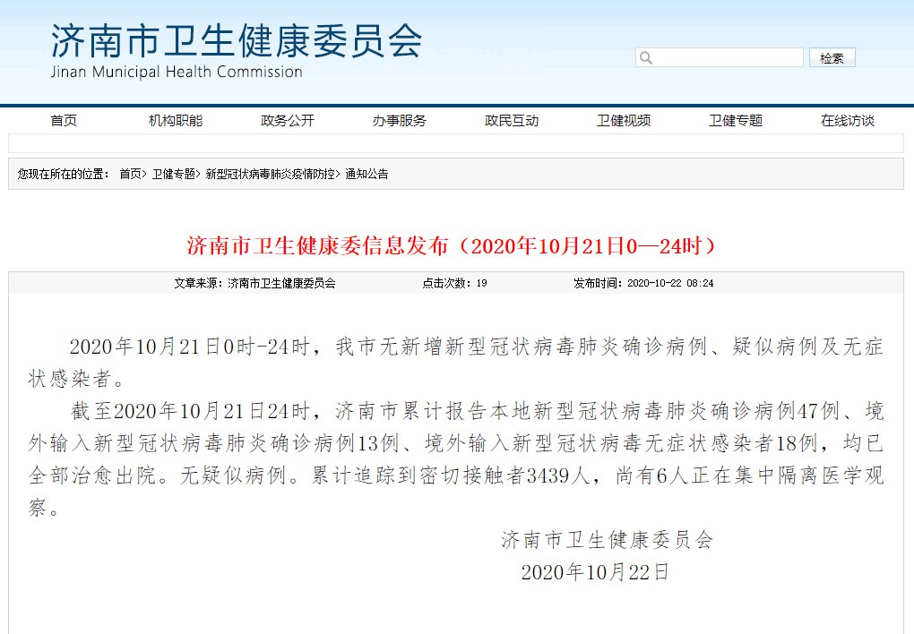济南市卫生健康委信息发布(2020年10月21日0时-24时)