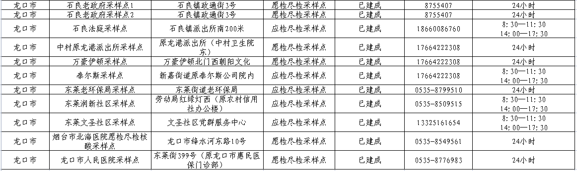 龙口市核酸检测常设采样点明细表
