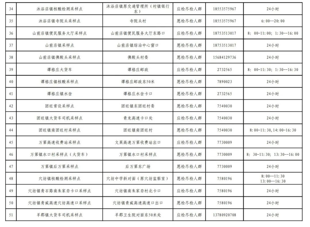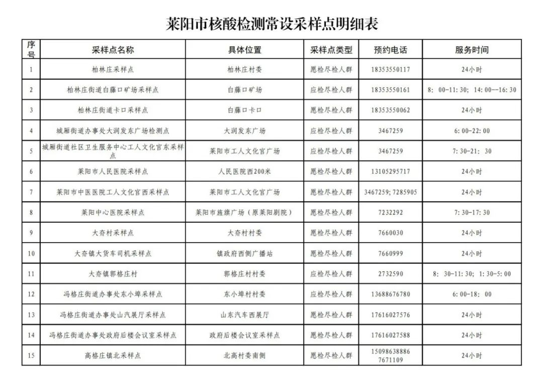 莱阳市核酸检测常设采样点明细表