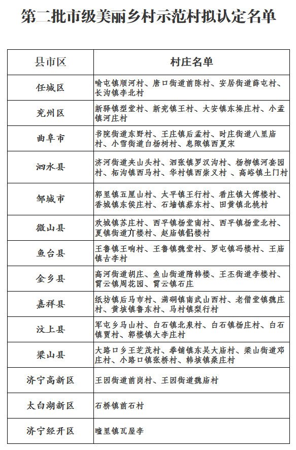济宁市级美丽乡村示范村拟认定名单 济宁市美丽乡村示范片区名单