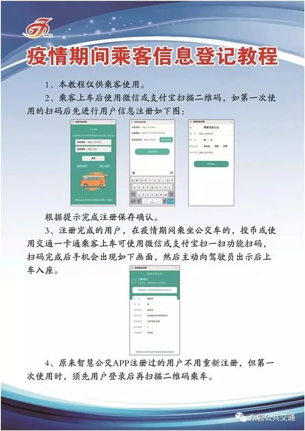乘客信息登记系统绑定运行车辆信息,“一车一码”,市民每登乘一辆公交车,使用支付宝或微信扫描车厢内“东营公交乘客信息登记”相应二维码,按流程操作完毕并主动向驾乘人员出示后方可乘车。该二维码仅记录乘客的手机号码和乘车时间,在每辆营运车辆明显位置均有张贴。