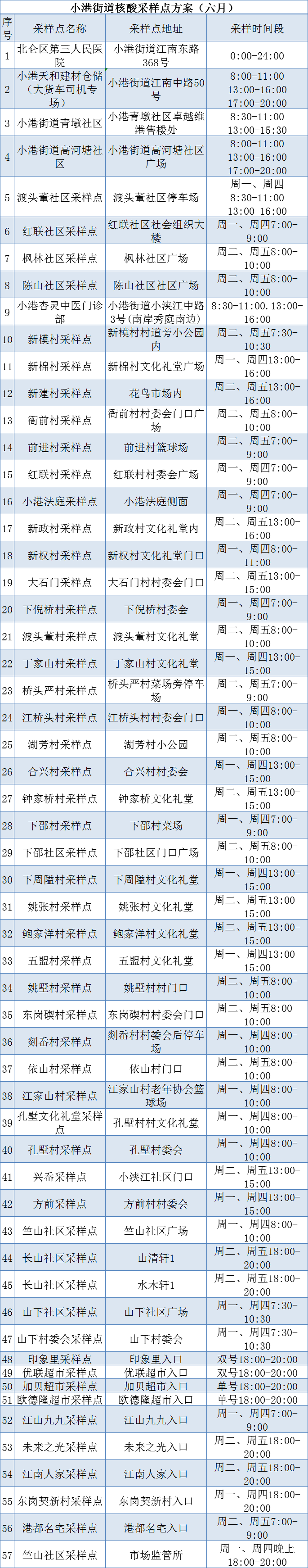 为方便辖区内居民核酸检测,6月(若后续有变动会另行通知)有需要的居民可在规定时间节点自行前往就近的核酸检测点位进行核酸检测,具体点位如下: