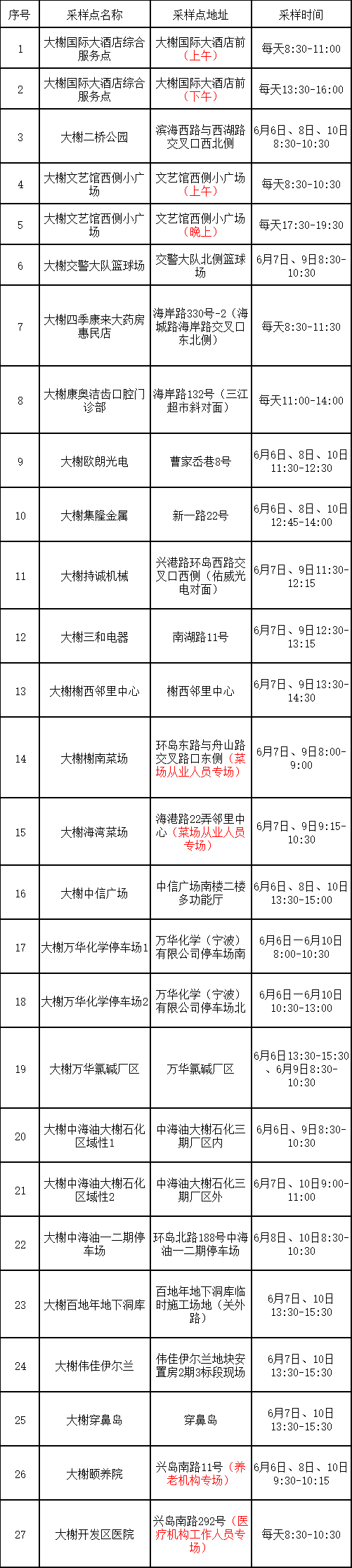为方便辖区居民核酸检测,6月6日—6月10日大榭街道设置了多个核酸采样点,有需要的居民可在规定时间内就近前往检测点位,具体安排如下: