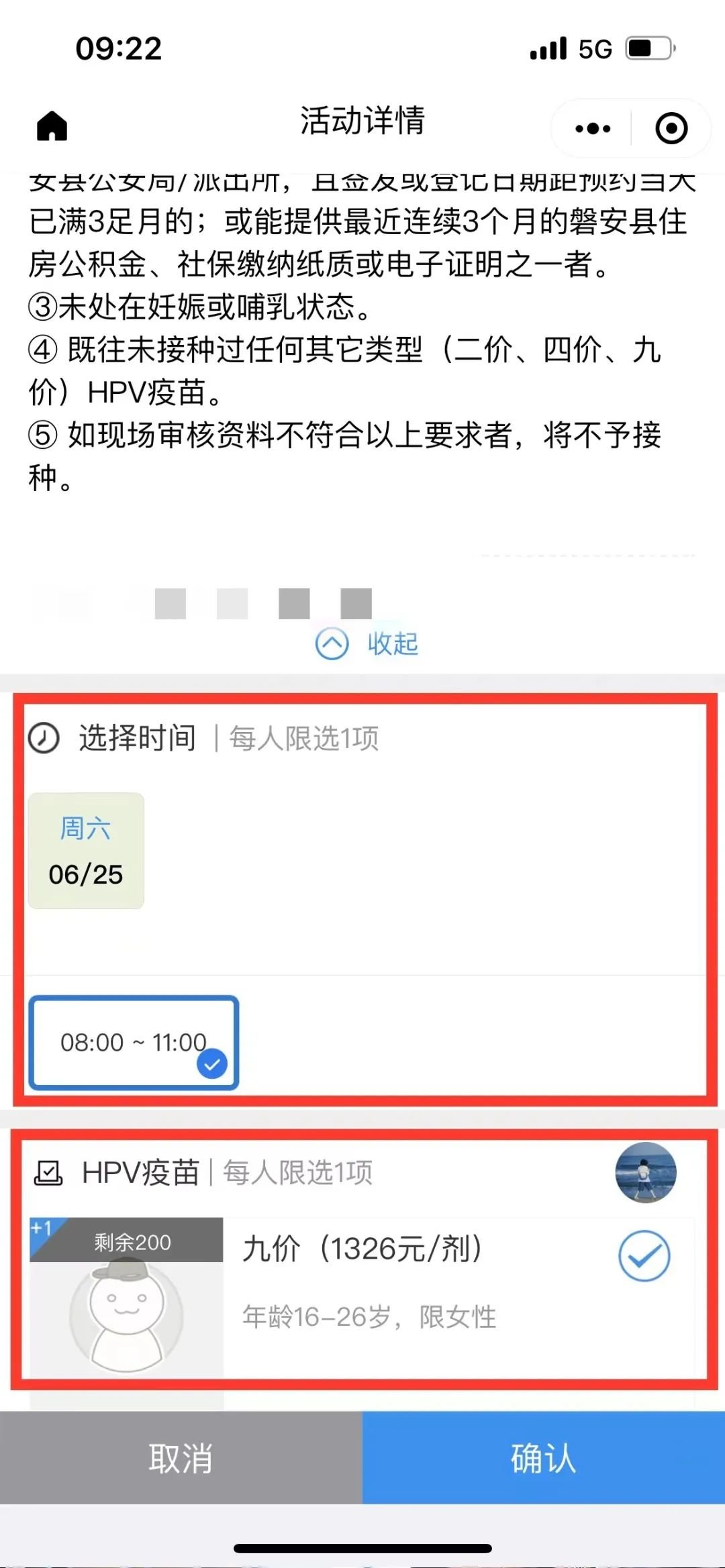②下拉活动详情页,在“选择时间”“HPV疫苗”两个栏目中进行勾选,并点击“确认”;