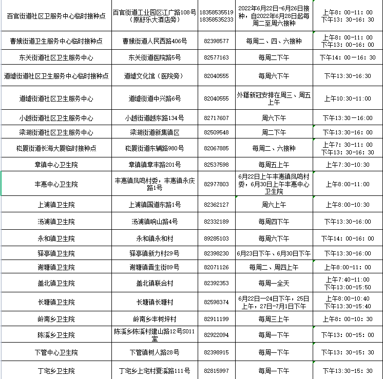 上虞区6月22日-7月3日各接种点新冠疫苗接种安排一览表