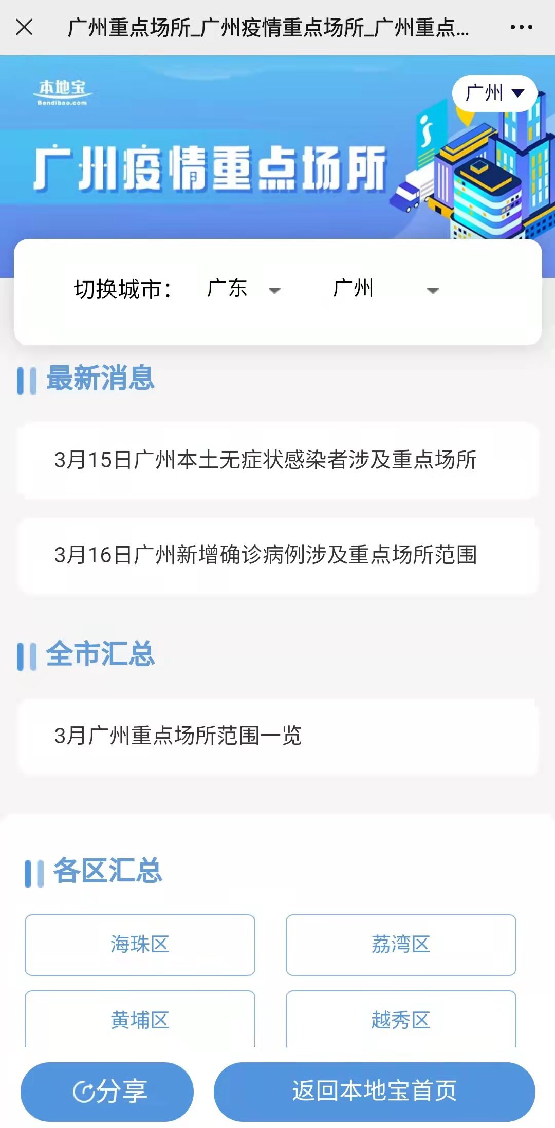 备注:可查询广州重点场所最新消息、全市最新消息、各区重点场所汇总以及获取封控管控地图查询入口