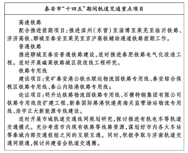 1.推进轨道交通网络建设。积极配合推进聊城至泰安至莱芜至京沪高铁辅助通道铁路等高速铁路及聊城至泰安等普通货运铁路项目前期工作。加快推进兖矿泰安港公铁水联运物流园等物流园区及企业铁路专用线建设,促进“公转铁”运输,适时推进泰肥铁路电气化改造工程,研判磁莱铁路城区段改线工程。适时开展市域轨道交通线网规划研究,推进城市轨道交通建设。积极争取与济南轨道交通网联通,探讨共建省会轨道交通圈,深度融入省会经济圈、加快推进济泰同城化进程。