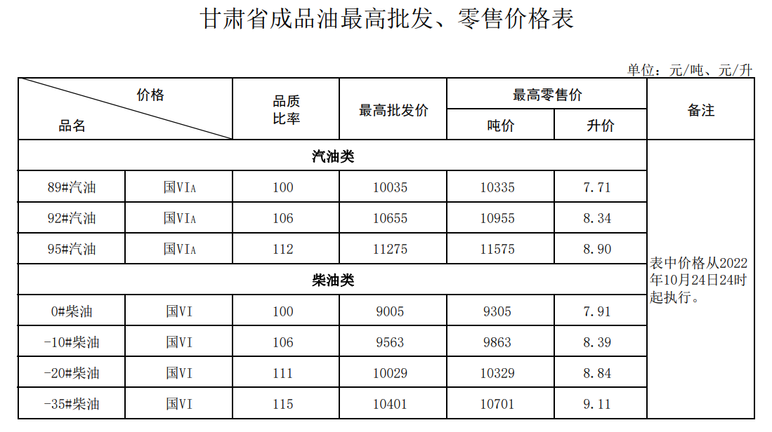 自2022年10月24日24时起,我省汽、柴油标准品价格分别上调185元和175元。调整后的各牌号汽、柴油最高批发、零售价格见附表。