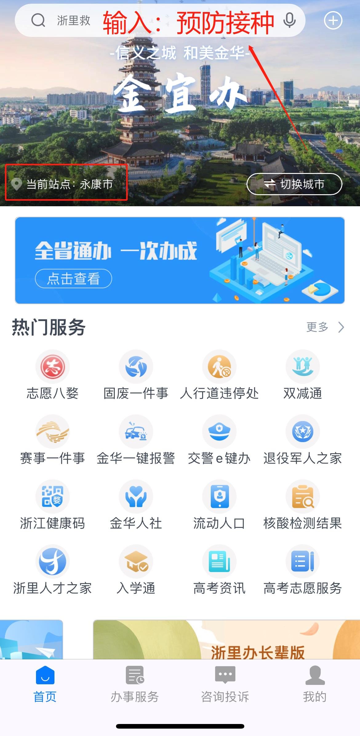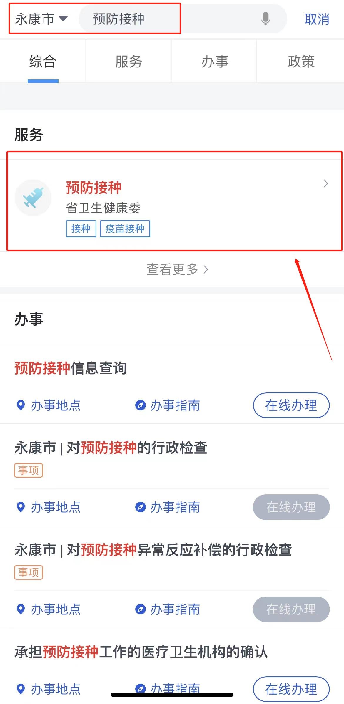 ①进入“浙里办”APP,定位为“永康市”,搜索框输入“预防接种”;