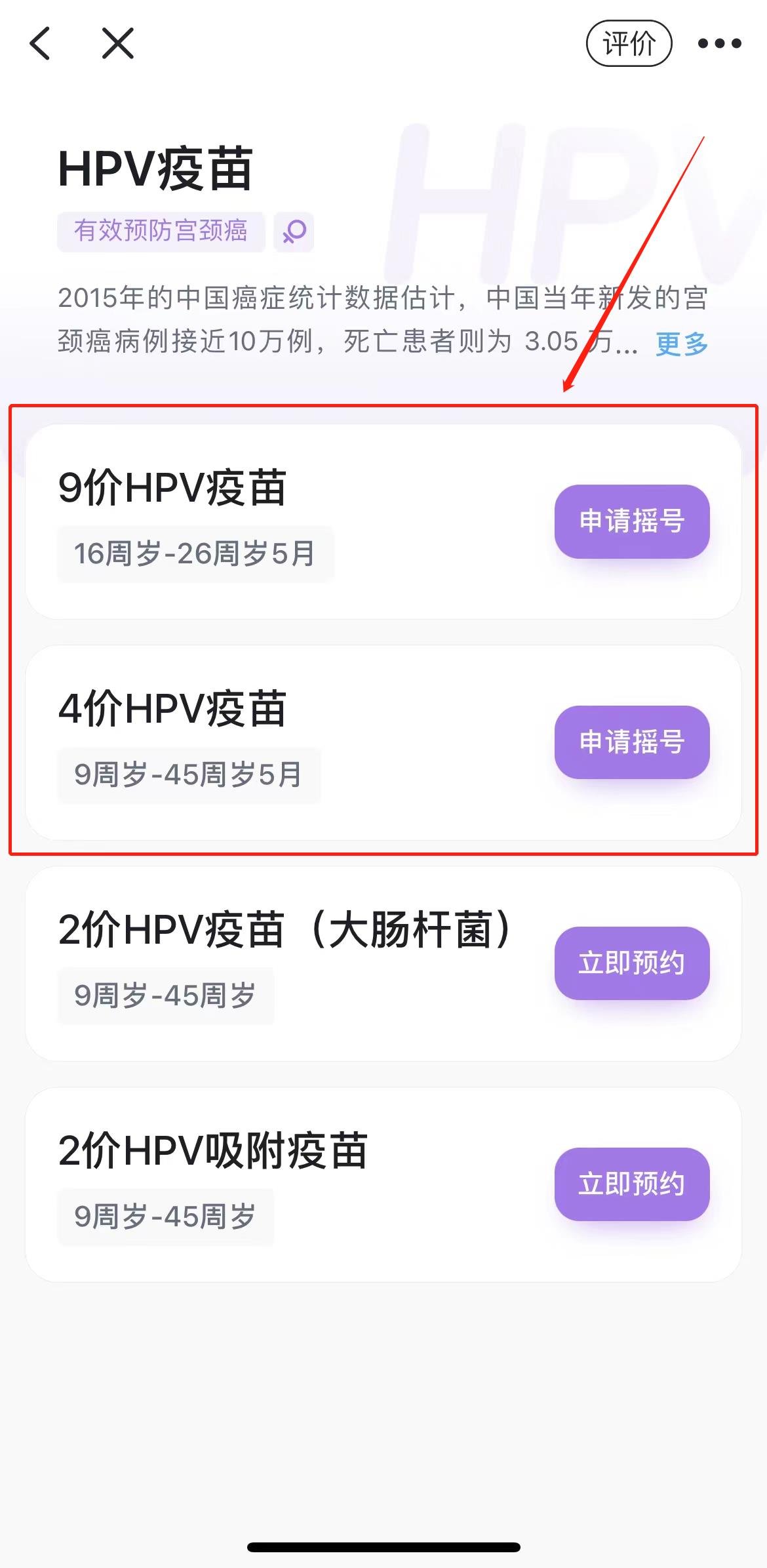 ④按需选择HPV疫苗种类,并点击“申请摇号”;