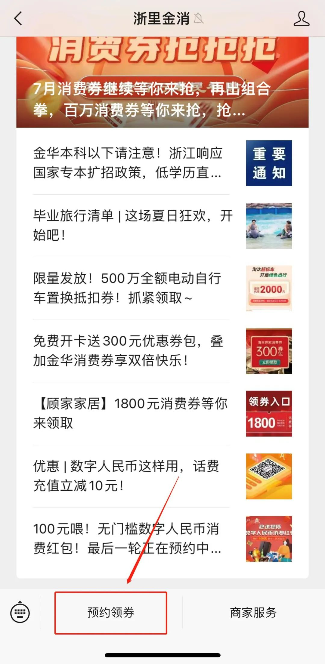 ①进入“浙里金消”微信公众号,点击“预约领券”;