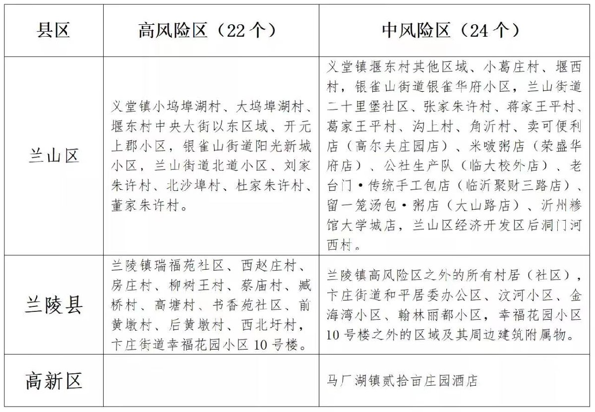 附:临沂市新冠病毒肺炎中高风险区一览表