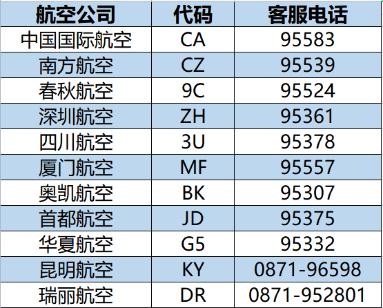 部分航空公司电话: