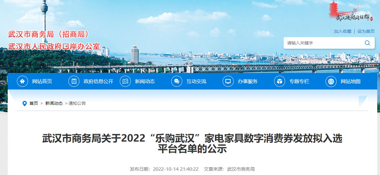 市商务局关于确认2022“乐购武汉”家电家具数字消费券发放平台的公告