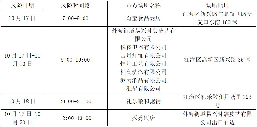 1.根据上述涉疫场所,同一时空与上述轨迹有交集的市民,请迅速致电所在村(社区)报备,并于10月21日前往就近的核酸小屋、便民机动采样点等检测点,做好个人防护,进行一次免费核酸检测,检测时请主动出示粤康码和行程卡,全程要严格戴好口罩,不交谈,与他人保持1米以上距离。可选择自驾车、摩托车、自行车、步行等方式前往,不要乘坐公共交通工具。检测时,请告知现场工作人员曾到过上述对应时间段的接触地点。如有疑问或需要帮助,可致电江海区疾控中心(电话:0750-3861723)。