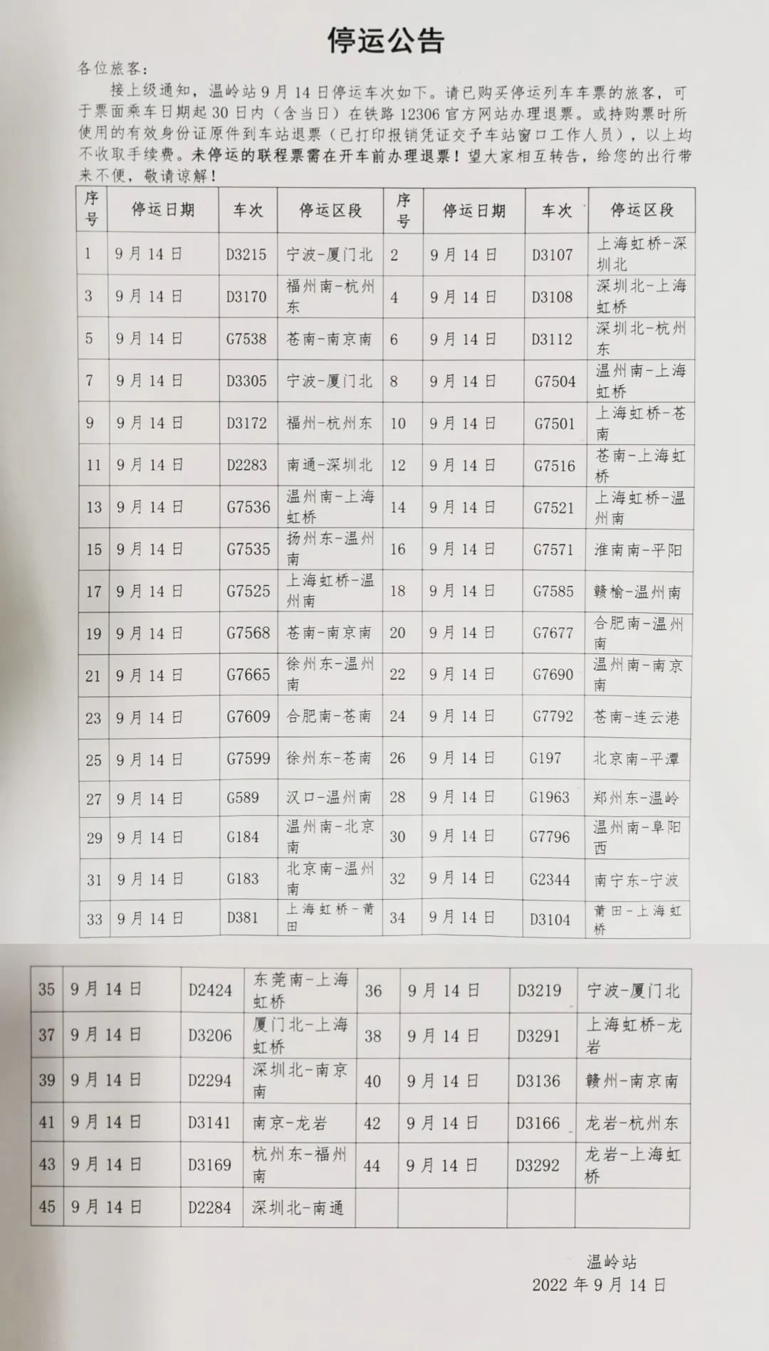 受到台风“梅花”的影响,温岭站9月14日停运车次如下。请已购买停运列车车票的旅客,可于票面乘车日期起30日内(含当日)在铁路12306官方网站办理退票。或持购票时所使用的有效身份证原件到车站退票(已打印报销凭证交予车站窗口工作人员),以上均不收取手续费。未停运的联程票需在开车前办理退票!望大家相互转告,给您的出行带来不便,敬请谅解!
