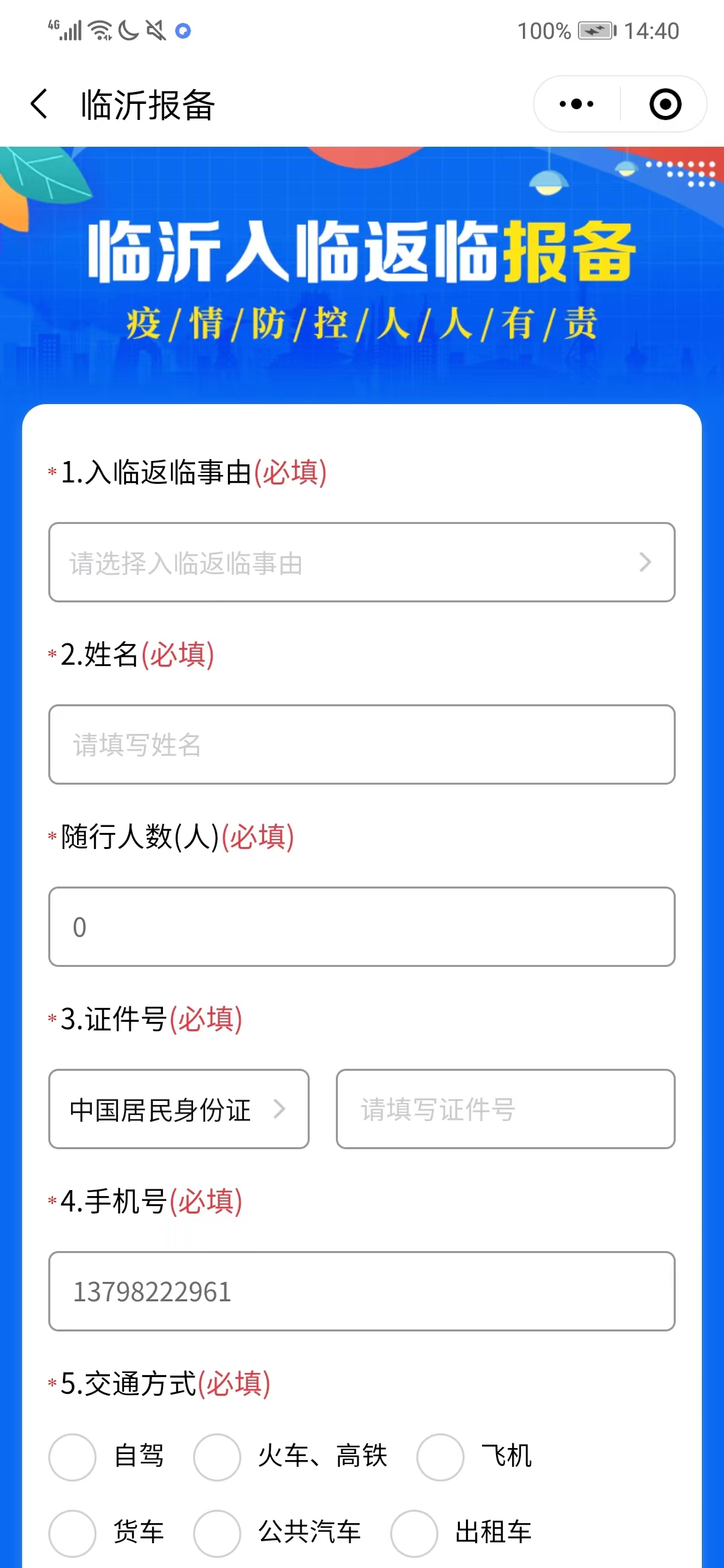 在“临沂报备”小程序中提前3天向目的地镇街报备,如实填写入临返临事由、姓名、身份证号码、手机号、交通方式、出发地、目的地等信息,并在抵达后配合查验。完成填写、提交后,系统自动将申报信息推送至目的地终端进行核实。