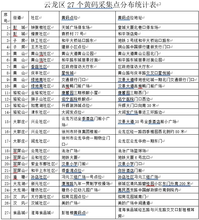 9、黄码人员听从各社区安排到专用核酸检测点位进行检测;近期没有按规定参加核酸检测存在一定风险的被赋“黄码”人员请到黄码采样点采样,“三天两检”后自动解除。(具体见《云龙区黄码采集点分布统计表》)