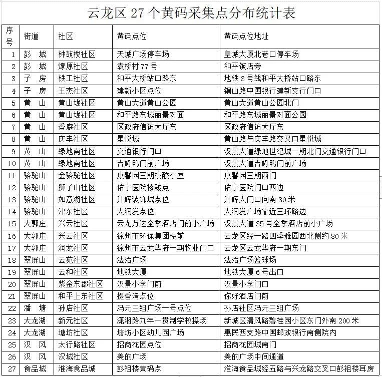 9、黄码人员听从各社区安排到专用核酸检测点位进行检测;近期没有按规定参加核酸检测存在一定风险的被赋“黄码”人员请到黄码采样点采样,“三天两检”后自动解除。(具体见《云龙区黄码采集点分布统计表》)