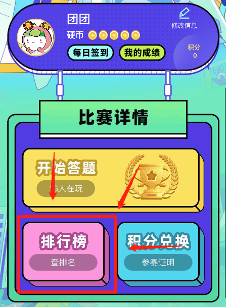 在这里会显示你的头像、昵称、硬币数、积分,硬币用于抽取题目盲盒,每天赠送5枚,每日签到可额外获得硬币,点击“我的成绩”可查看个人海报,如果需要修改个人资料或者不小心选错了专场,可以点击“修改信息”进行调整。
