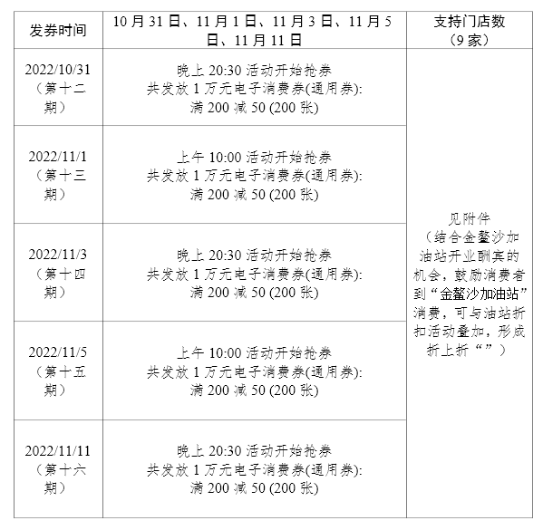 洪梅镇11月消费券分五轮发放,分别于10月31日、11月1日、11月3日、11月5日、11月11日发放,每轮发放1万元,发放总额5万元。