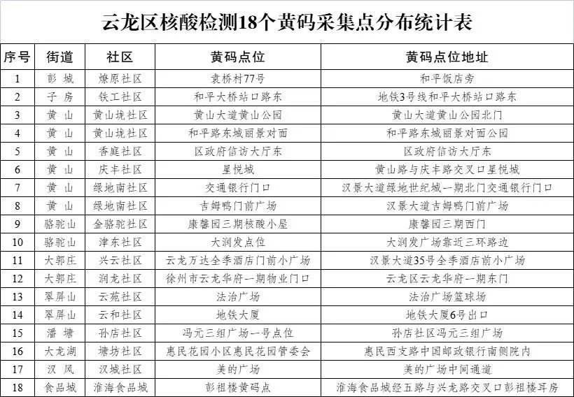 9、黄码人员听从各社区安排到专用核酸检测点位进行检测;近期没有按规定参加核酸检测存在一定风险的被赋“黄码”人员请到黄码采样点采样,“三天两检”后自动解除。(具体见《云龙区黄码采集点分布统计表》)