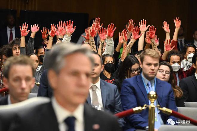 布林肯身后的抗议者