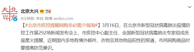 具体内容:近期国内多地有境外邮件、衣物及其他物品阳性的报道,市民网购商品时要提高防范意识。