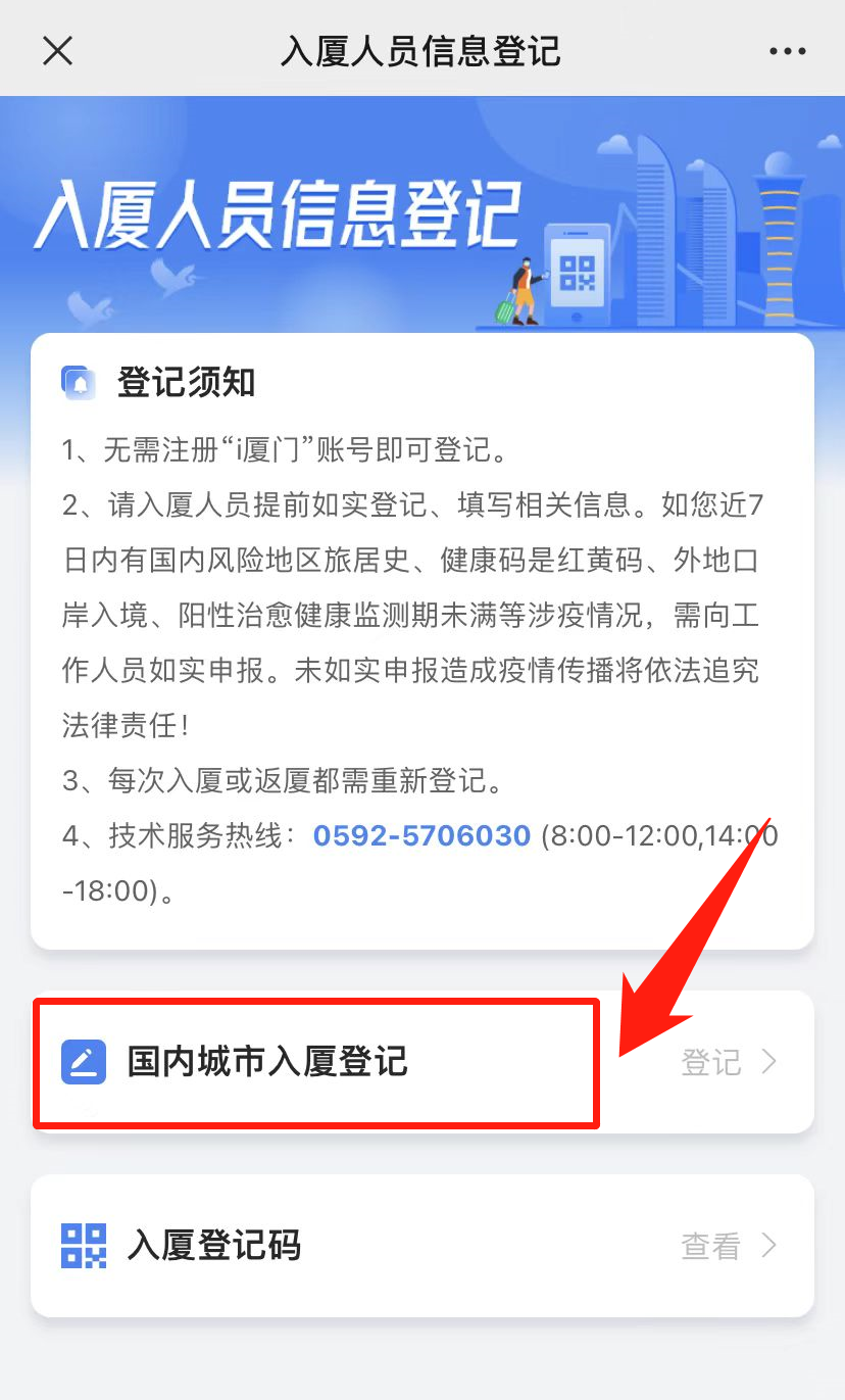 2、阅读登记须知,点击“国内城市入厦登记”;