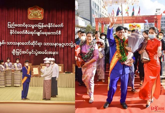 2021年12月,在缅甸首都内比都举行的隆重仪式上,“企业家”刘正祥获得了“国家最高弘法杰出贡献奖”。刘正祥获奖回到果敢后,当地政要设宴欢庆,鲜花、红毯、礼炮等璀璨元素齐备,新闻图显示现场气氛热烈、豪华。
