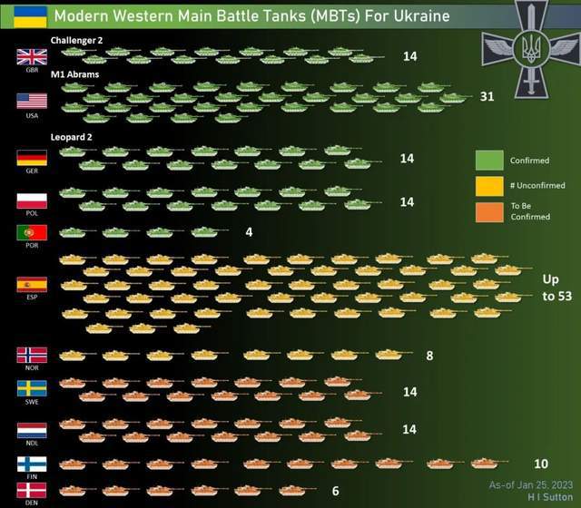 除美国提供31辆艾布拉姆斯坦克外,英国、德国、波兰、荷兰、西班牙、丹麦、葡萄牙等美国拥趸接连送出援助,乌克兰驻法国大使瓦迪姆·奥梅琴科表示,已经正式确认同意向乌克兰提供重型坦克已经有321辆。