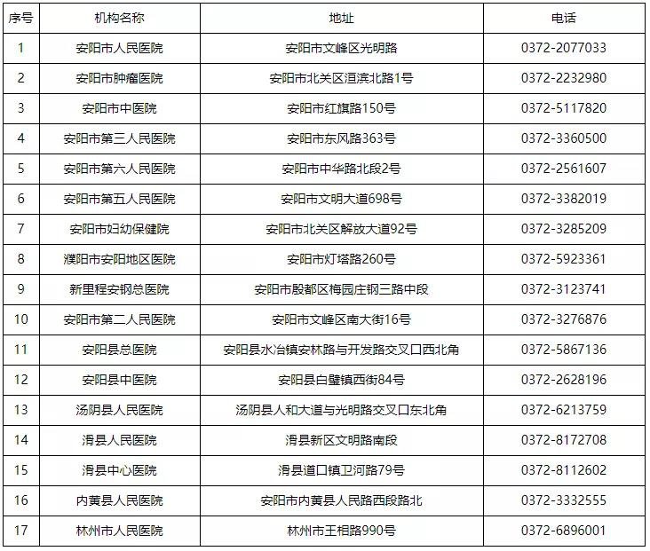 2021年1月4日,安阳卫生健康委员会发布通知,公布安阳具备核酸检测能力的医疗机构名单如下(附相关的咨询电话)。