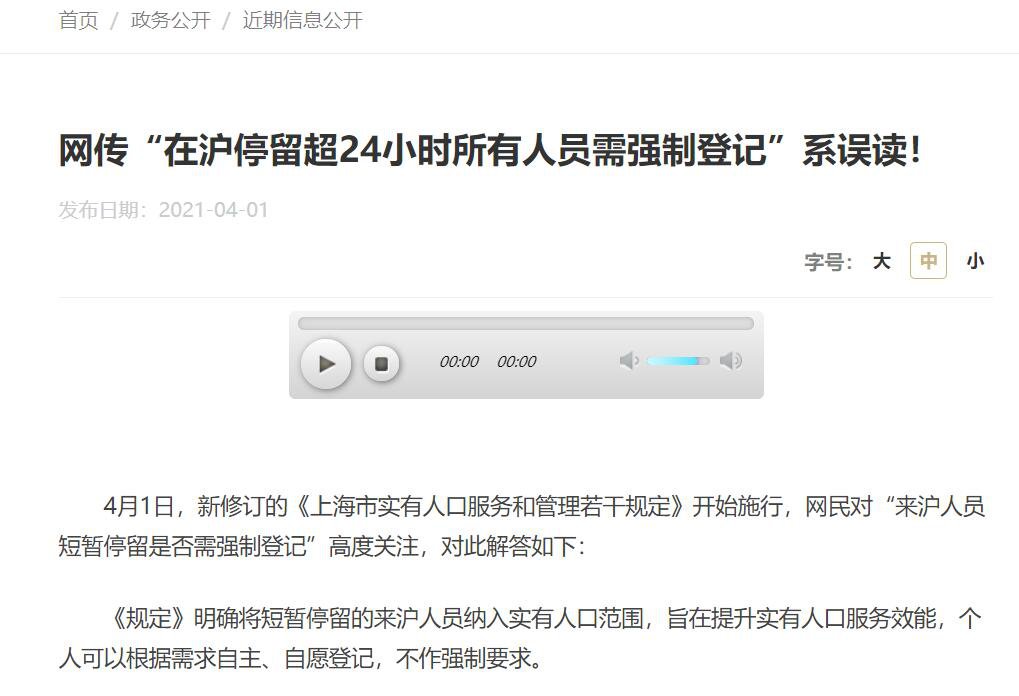 4月1日,新修订的《上海市实有人口服务和管理若干规定》开始施行,网民对“来沪人员短暂停留是否需强制登记”高度关注,对此解答如下: