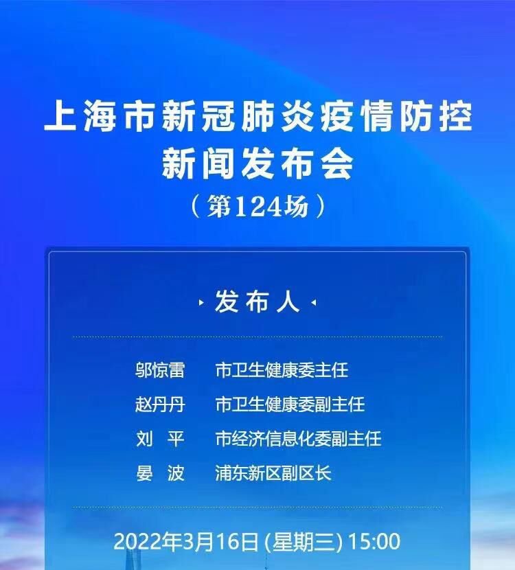 2022年3月16日下午15:00,举行上海市第124场疫情防控工作新闻发布会,市卫生健康委主任邬惊雷、浦东西区副区长等相关负责人介绍本市疫情防控最新情况。最新消息请关注新闻发布会及上海官方发布。