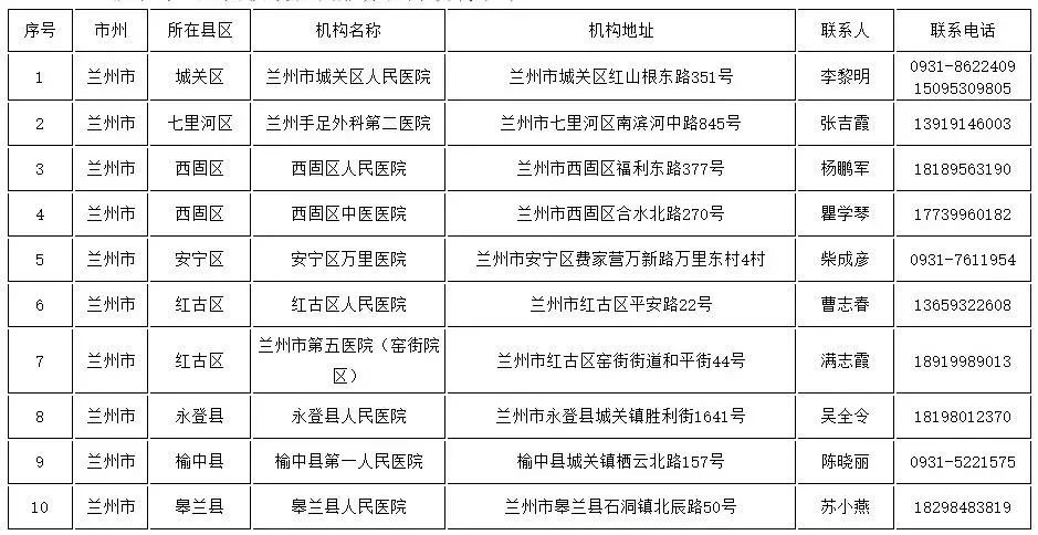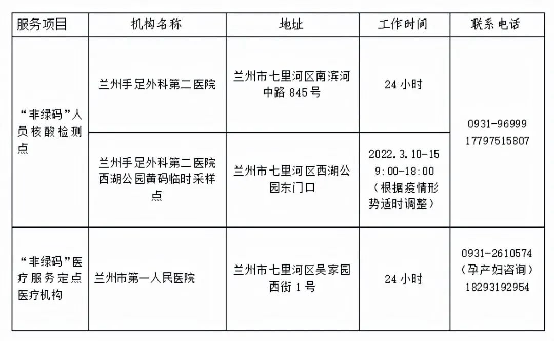 兰州市“非绿码”人员核酸检测服务医疗机构名单