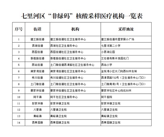 根据七里河区疫情防控形势,为方便群众,特在全区范围内设置14个集中免费“非绿码”核酸检测采样点。此外,所有社区卫生服务站均可免费进行“非绿码”人员核酸采集,请“非绿码”群众就近前往。